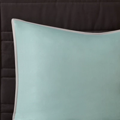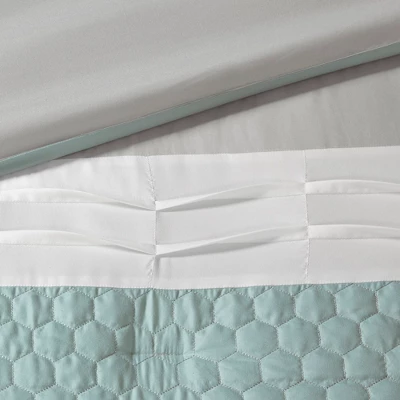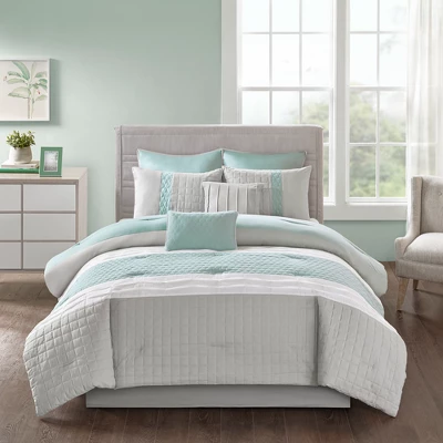- Transitional 8 piece microfiber comforter set with quilted, pieced, and pleated details