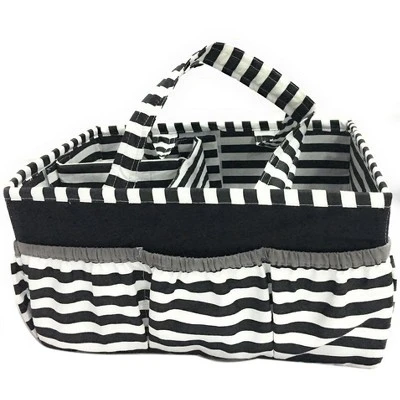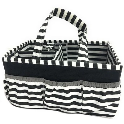 Add organization to any area of your home with the portable Nursery/Toddler Storage Caddy by Bacati. Perfect for dressers and changing stations, this lightly padded caddy has 8 outer pockets and a removable “T” separator for maximum versatility. The soft cotton percale fabric with stiffner inside keeps the shape intact, lining and handles feature a padded with polyfilled and cordinating trim. Keep diapers, wipes and other necessities tidy while traveling from room to room. Caddy also functions as an organizer for crafts, picnics, pet supplies, etc. Measures 12.5 in x 6.25 in x 8.5 in.
