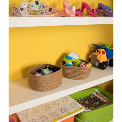 This two pack of woven storage baskets is great for small storage around the house or laundry collection. They are made from brown hemp rope and are round with no corners. The rope is sturdy enough that the baskets stand up on their own. They can make a great gift for housewarming, infant baptism, wedding, birthday and more.