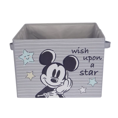 Mickey Mouse is the longtime mascot of The Walt Disney Company. This officially licensed Mickey Mouse foldable storage is sturdy and durable. It features Mickey on a gray background with white and blue lines. He is 7 ¼ā tall and drawn in a dark gray and white sketchy style. The words āwish upon a starā are printed along with four stars that are blue, white, and creamy yellow. There are two side handles for easy carrying. The storage container is 12 ½ā X 11ā X 9ā.