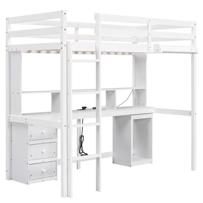 This versatile loft bed can meet your every need. Storage shelves, 1 cabinet, 3 drawers and 1 bedside tray provide ample storage space. The built-in desk comes with 2 standard plug sockets and 2 USB ports for your entertainment or study convenience. This loft bed comes with LED lights, perfect for your colorful nightlife. This bed is the perfect finishing touch to your bedroom.