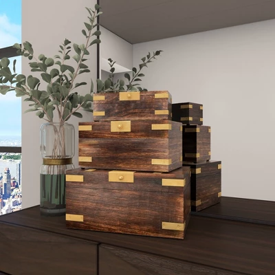 Perfect way to add depth and texture to your surface space with this compact and discreet box. A practical yet stylish upgrade that instantly elevate the look of your room. Use these jewelry organizer boxes together or separately to store personal belongings in the boudoir or bedroom or showcase table displays in the living room. Designed with felt or rubber stoppers at the base that prevent scratching furniture and table tops, as well as sliding around. This item ships in 1 carton. Mango wood box makes a great gift for any occasion. Suitable for indoor use only. This item ships fully assembled in one piece. Made in India. This brown colored decorative keepsake box comes as a set of 3. Traditional style.