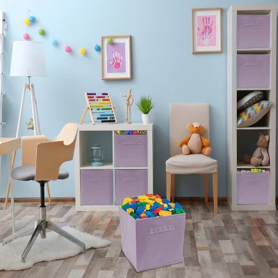 Perfect for organizing and cutting down on clutter, these Collapsible Storage Cubes add functionality to your cube organizer! Fabric drawers easily side in and pull out of cube shelves thanks to their sewn in handles! Both durable and easy to use, these Collapsible Storage Cubes are a terrific choice! These Collapsible Storage Cubes have been specially designed to fit perfectly with their Storage Cube counterparts. Together they form an unbeatable combination of color, organization, and style. Store anything from toys to laundry inside these sturdy cubes that feature bright colors with a strong handle. From wrangling household items to collecting unruly toys, camouflage and conceal some of the most common household eyesores. In the kidās room, create a functional play area where Legos, books, and stuffed animals have a cozy cube to call home. Bins are lightweight, sturdy, and easy for kids to place on the floor to grab their favorite toy. When not in use, slide them underneath a bench or back inside your cube organizer stand until the next play date. These bins also transform a closet or laundry room when filled with linens, clothes, seasonal items, holiday ornaments, and much more. The possibilities are endless! The collapsible design assembles in seconds and folds flat for easy storage. Made of nonwoven polypropylene and cardboard with colorful lightweight fabric. Bins complement cube storage organizer shelves and provide adequate space to sort your clutter. A side handle allows for easy transportation. Measures approximately 11 inch L x 11 inch H x 10.5 inch W. Soften storage with lightweight bins that make a practical, attractive addition to any room.