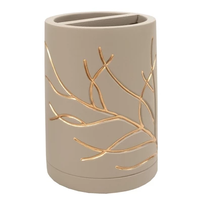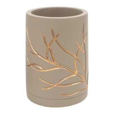 Bring the Woods to your bathroom with Branches bathroom accessory set. This modern handcrafted Concrete collection is luxurious, stylish, and helps keep your bathroom dĂŠcor clean, fresh, and organized. The set includes: a tumbler, lotion/soap dispenser, toothbrush holder and soap dish. The Branches accessory collection is Taupe with Gold color branches. Each piece is hand crafted in a durable Concrete. Easy to wipe clean and made to last a lifetime. This ultra-luxurious collection will surely add contemporary charm to your bathroom.