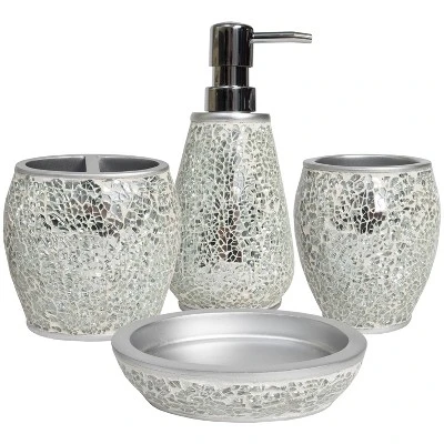The Glamour bathroom accessory set adds sophistication and a touch of glamour to your bathroom dƩcor. This modern handcrafted resin collection is luxurious, stylish, and helps keep your bathroom dƩcor clean, fresh, and organized. The set includes: a tumbler, lotion/soap dispenser, toothbrush holder and soap dish. The Plaza accessory collection is designed with a cracked glass and silver finish for a subtle addition of style. Each piece is hand crafted in a durable resin. Each item is easy to wipe clean and made to last a lifetime. This ultra-luxurious collection will surely add contemporary charm to your bathroom.