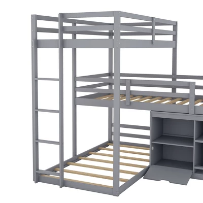 Twin Size L-shaped Wood Triple Bunk Bed With Storage Cabinet, Ladder And Blackboard-ModernLuxe