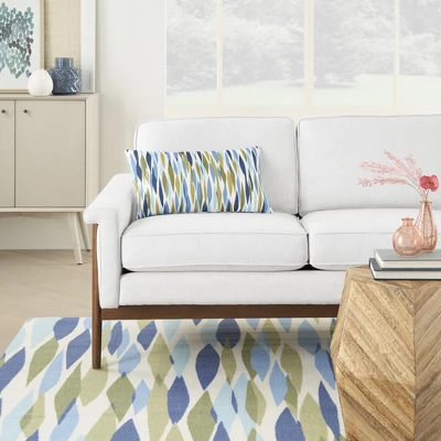 With its retro-inspired overlapping diamond pattern, this outdoor throw pillow brings dynamic energy to indoor and outdoor spaces alike. Presented in shades of blue and green, this contemporary design reverses to an abstract floral pattern in blue on a ground of white. Made from smooth polyester fabric. Polyester insert included; zipper closure.
